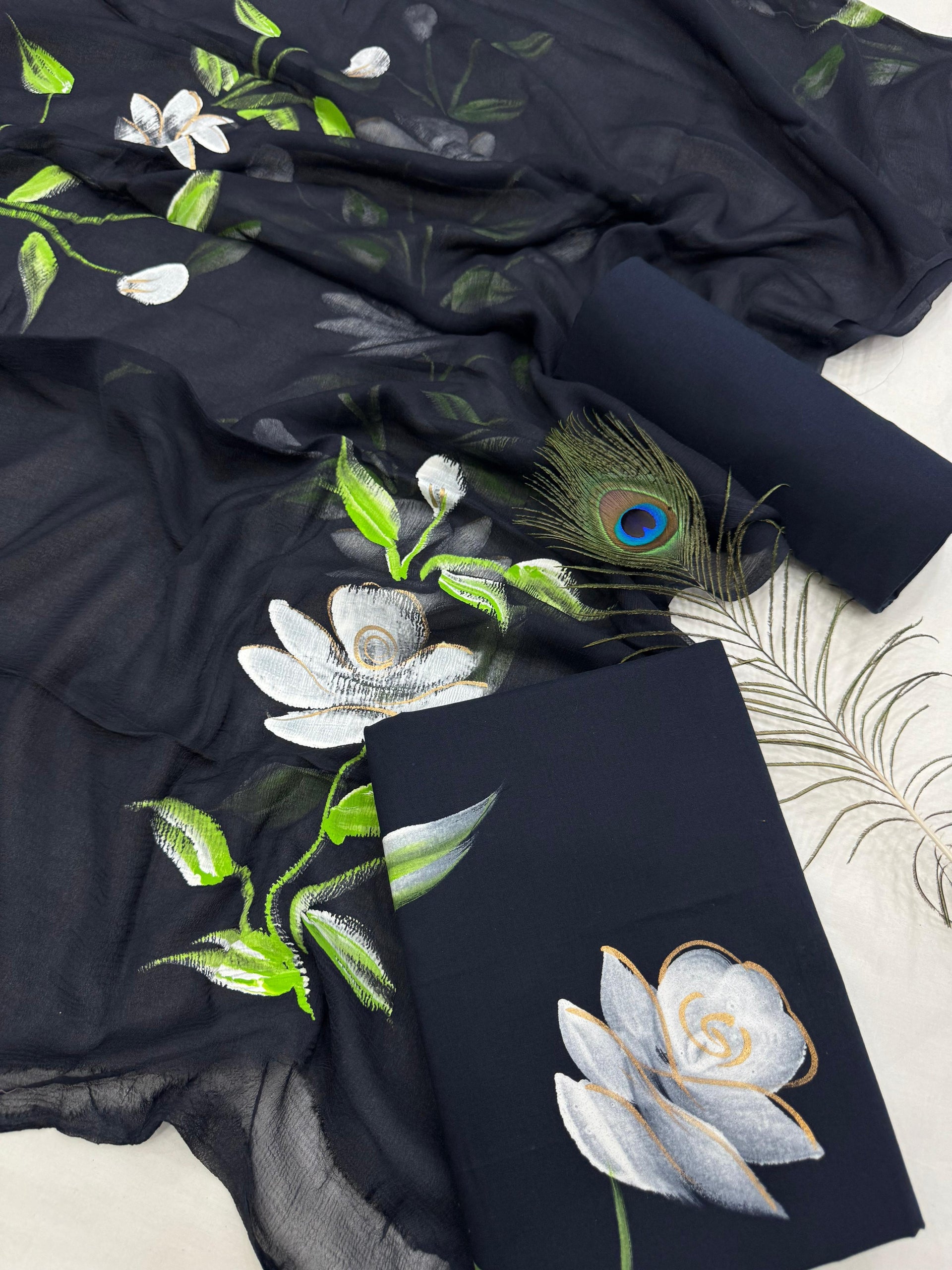 Hand Painted Cotton Suit set with Chiffon Dupatta
