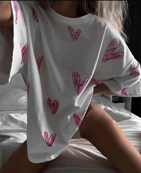 Fall in love with our Hand-Painted Pink Heart T-shirt, a charming blend of art and fashion. Each shirt features a beautifully painted pink heart, making every piece unique. Crafted with soft, high-quality fabric and durable paints, this T-shirt is perfect for adding a touch of romance to your everyday style. Show your heart on your sleeve—literally! Shop now to get your own hand-painted masterpiece.