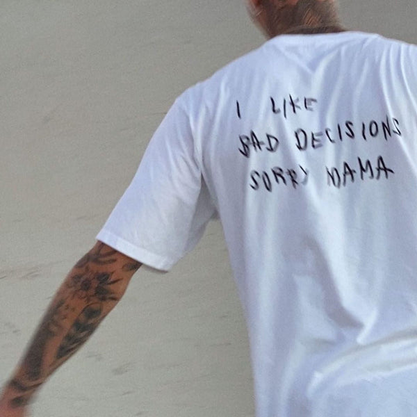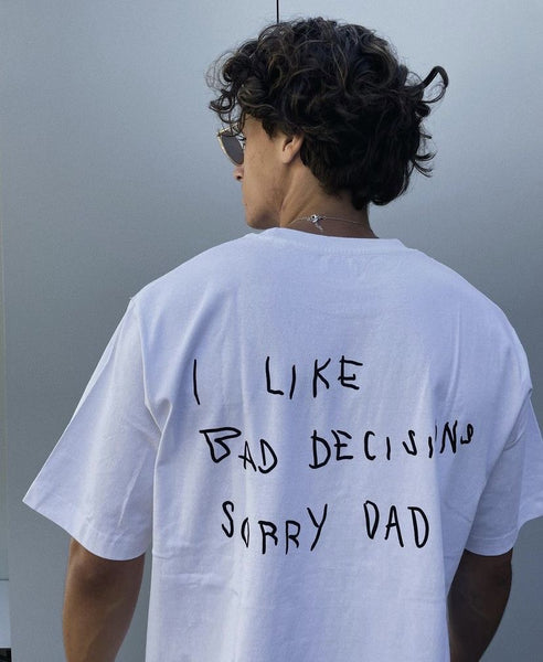 Introducing our hand-painted "I Like Bad Decisions, Sorry Dad" T-shirt – the perfect blend of humor and artistry. Each shirt is crafted with care, ensuring every piece is unique. Made from high-quality fabric and painted with durable, vibrant colors, this T-shirt is designed to make a playful statement. Whether you're embracing your rebellious side or just having a bit of fun, this tee is a must-have. Get yours today and add a touch of personality to your wardrobe!